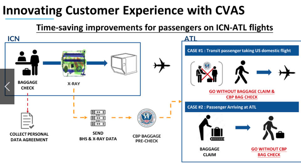 Dịch vụ này hiện đang được triển khai duy nhất 1 điểm ở ATLANTA là hãng Korean Air + Delta Airlines khai thác ... Khi Hành khách hàng làm thủ tục tại VN ,Nếu khách muốn hành lý được chuyển thẳng đến điểm cuối nội đia Mỹ thì phải thông báo cho nhân viên làm thủ tục và nhận 1 cái form , Nội dung là đồng ý cho Hải Quan HÀN QUỐC kiểm tra hành lý ký gửi , nếu đồng ý thì ký và ghi họ tên vào form này , Hành khách sẽ nhận đủ boarding pass cho các chặn bay trên vé , như vậy khi đến ATLANTA thì chỉ cần mang hành lý xách tay qua chuyến bay nội địa sau khi hoàn tất thủ tục nhập cảnh Mỹ .