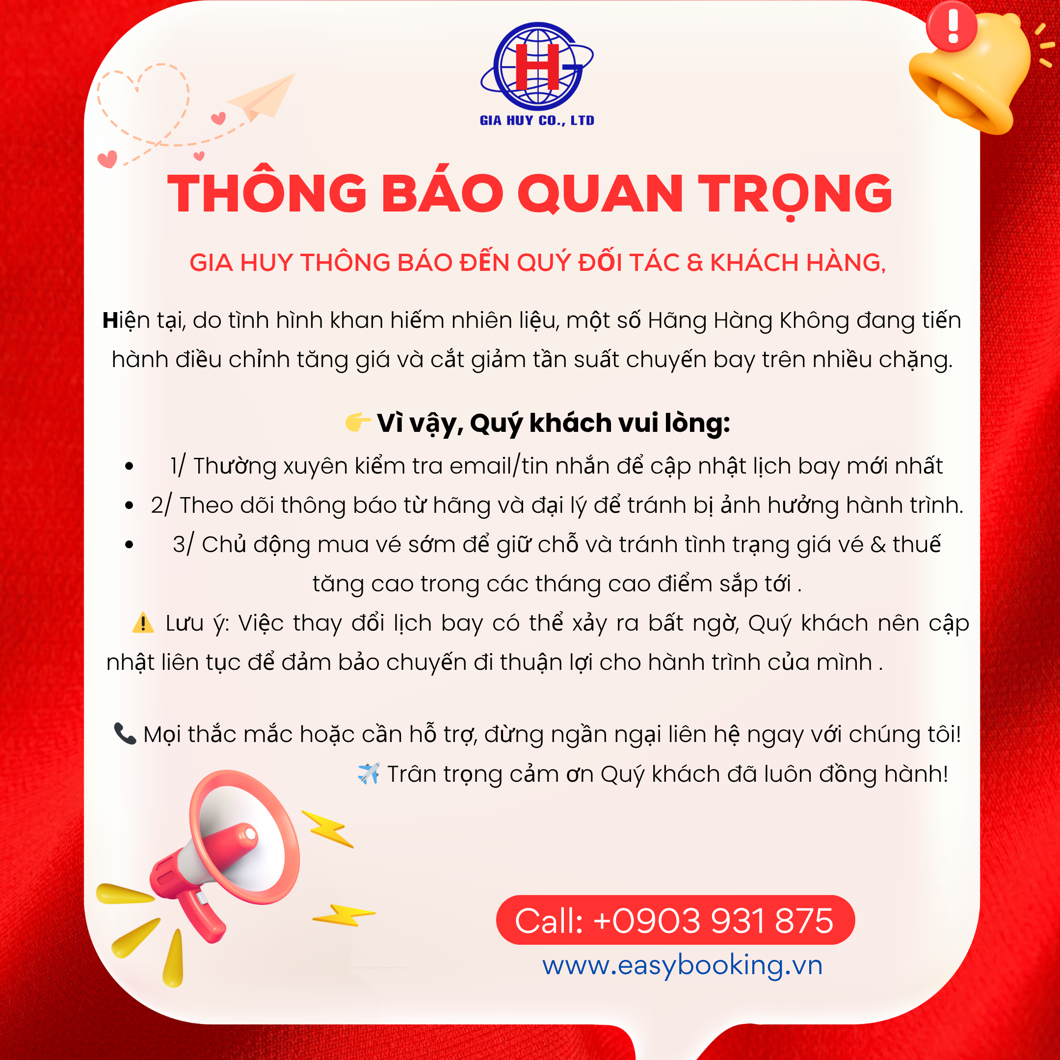PHÒNG VÉ GIA HUY thông báo đến quý đối tác & khách hàng,