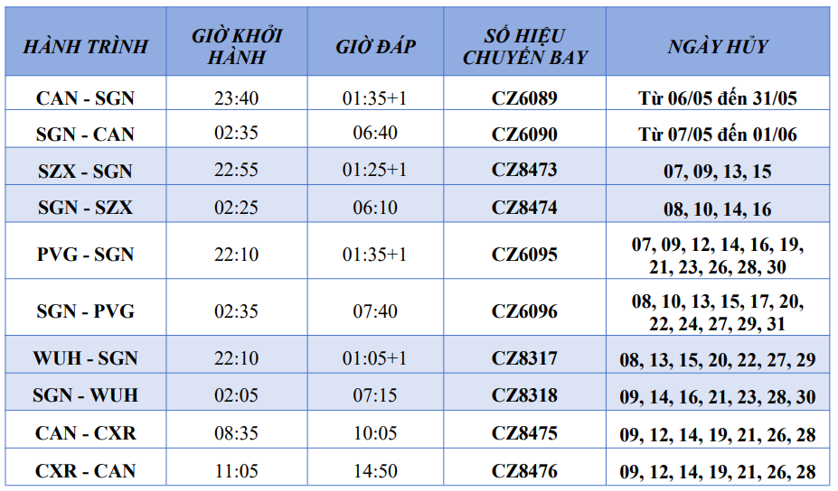 Các chuyến bay khác của China Southern ngoài phạm vi kể trên khai thác theo kế hoạch như thường lệ.