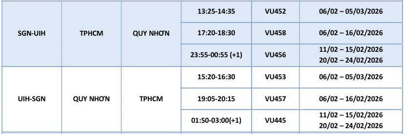 Nhằm đáp ứng tối đa nhu cầu đi lại tăng cao của hành khách trong dịp cao điểm Tết Nguyên Đán Bính Ngọ 2026, Vietravel Airlines Khai thác trở lại đường bay TP. Hồ Chí Minh (SGN) - Quy Nhơn (UIH) từ ngày 06/02/2026 với giá vé đặc biệt ưu đãi chỉ từ 1K, giờ bay khai thác như sau: