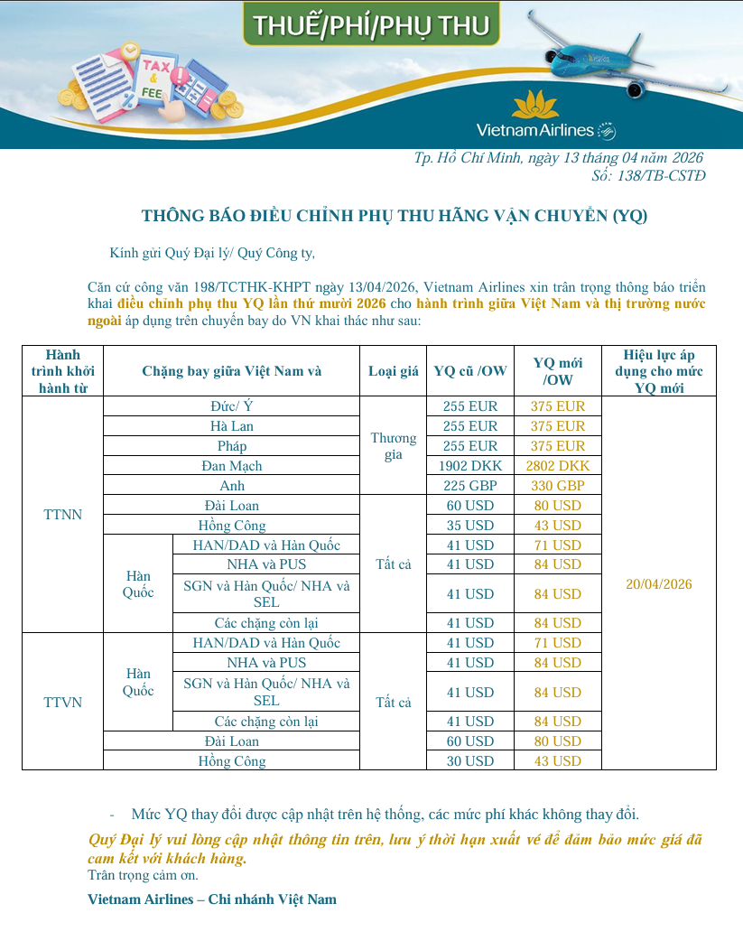 [VNA - THUẾ/PHÍ] YQYR10.2026-Triển khai điều chỉnh phụ thu YQ lần thứ mười các hành trình giữa TTVN và TTNN - HL 20.04.2026